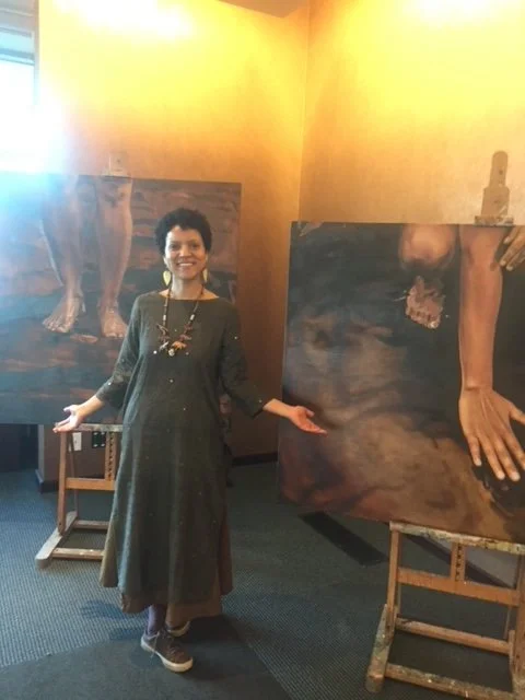 Tiffany Freeman with her oil paintings, Nyack Library Community Room, 2020.